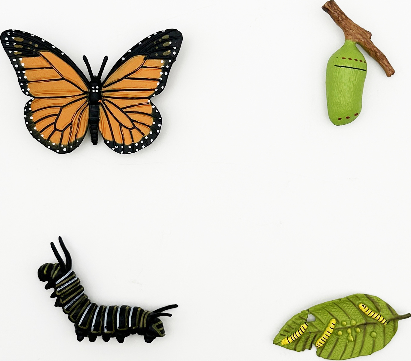 Figurka Motýl 4 vývojové fáze. Velikost 8 cm. 4 varianty – vajíčka, housenka, kokon, motýl.
