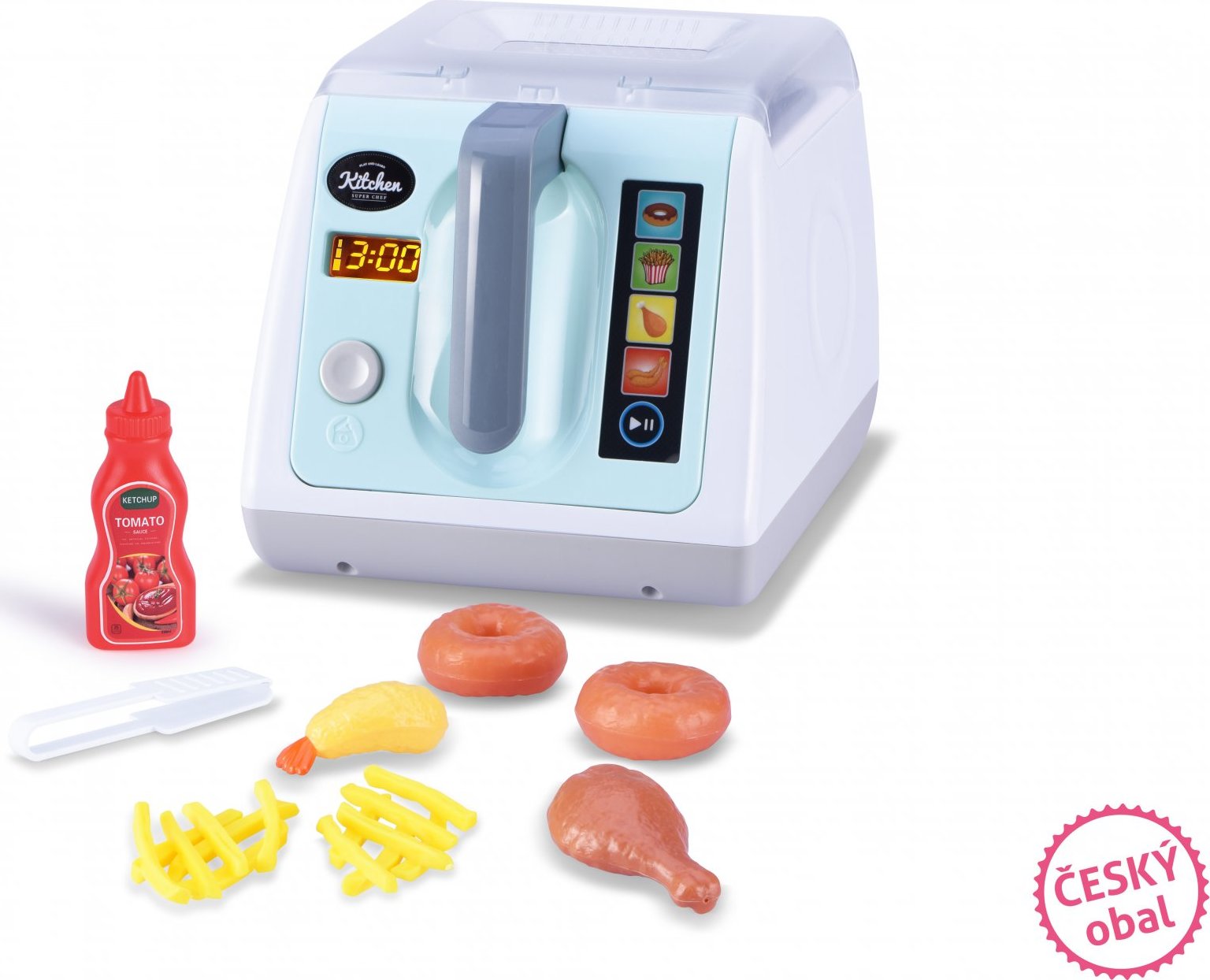 Obsah balení – fritovací hrnec, 2x hranolky, 1x kuřecí stehno, 1x kreveta, 2x donuty, naběračka, kečup. Vydává světelné a zvukové efekty, časovač. 2xAA baterie jsou součástí balení.