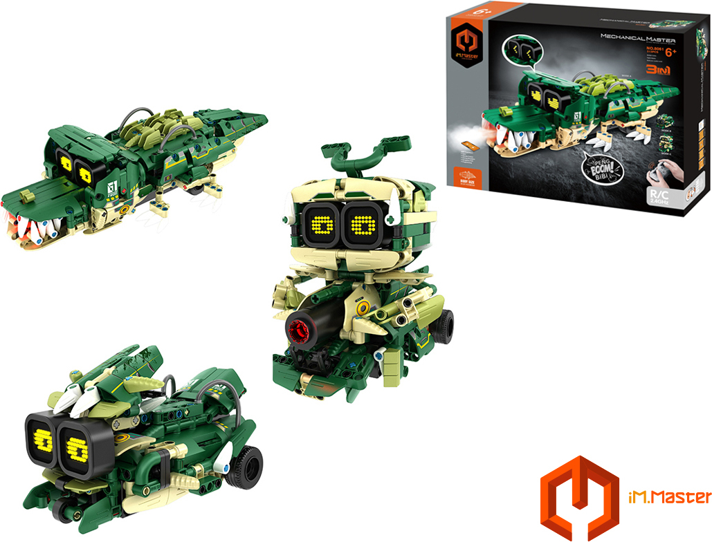 iM.Master Stavebnice robot krokodýl 3v1 RC na dálkové ovládání. Rozměry 34,3×14,5×8 cm. 513 dílků. Ovládání ovladačem nebo smartphonem. Frekvence 2.4GHz. Bluetooth propojení s mobilem. Aplikace pro iOS a Android. Světelné a zvukové efekty. Bateriový pack 300mah 7.4V lithium do robota součástí, 2xAA do ovladače nejsou součástí. USB nabíjecí kabel součástí. Přepínač ON/OFF na ovladači a bateriovém boxu robota.