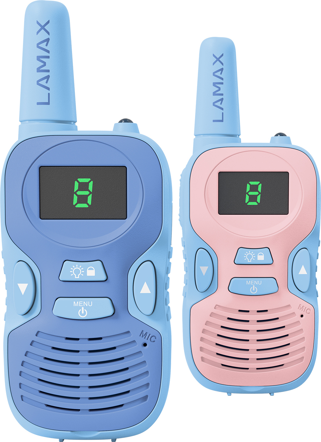 Dětské vysílačky, Dosah 2 kilometry, 3 úrovně hlasitosti, LED displej, Vestavěná svítilna, 8 kanálů, Čistý zvuk, Intuitivní ovládání, Vyměnitelné přední panely (modrá/růžová)