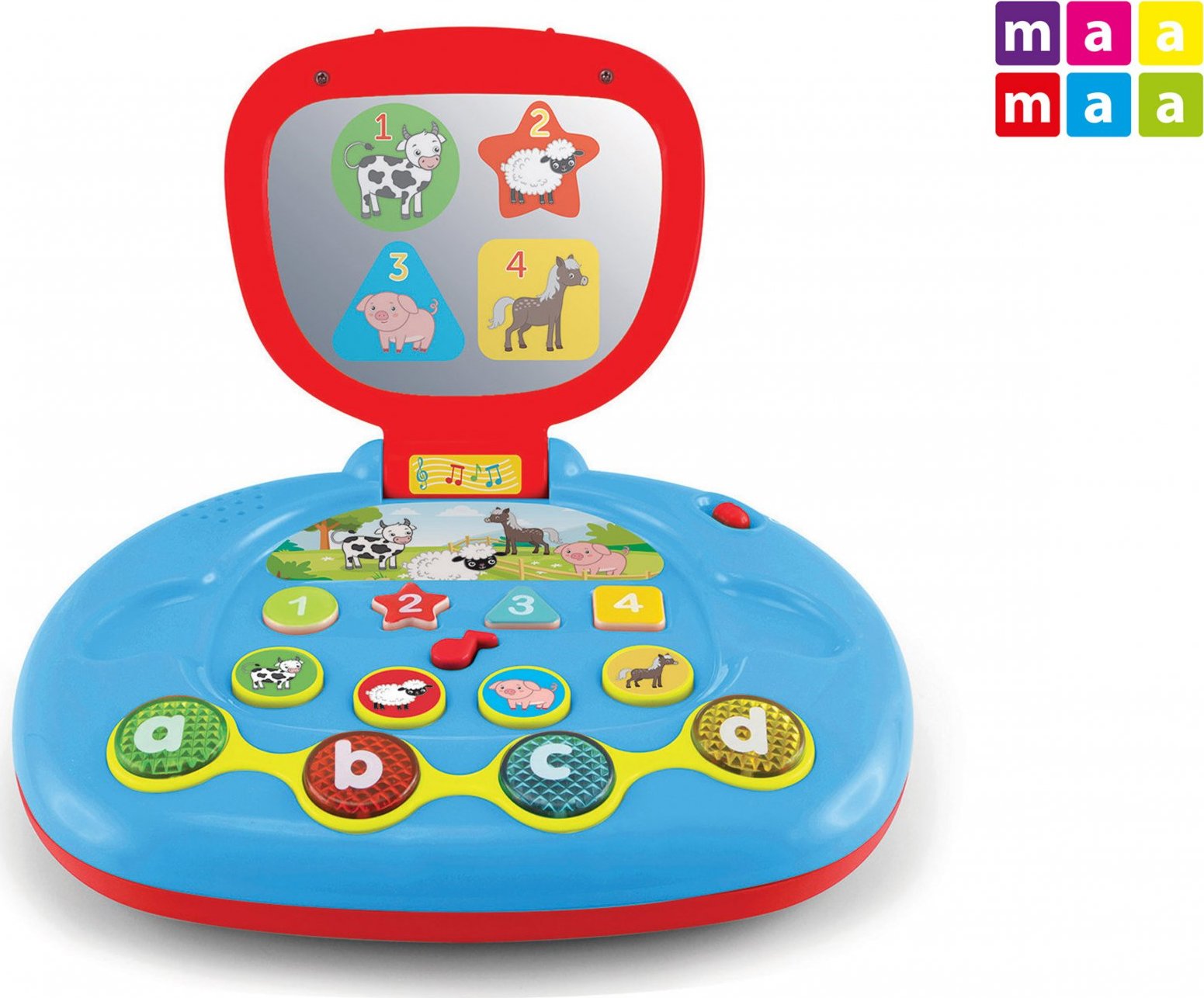Dětský počítač – mluví česky. Rozměry 20×16 cm. Světelné a zvukové efekty. 3xAA baterie součástí. Promítání (displej) v zrcátku. Přepínač – vypnuto, nižší, vyšší hlasitost. Výuka čísel, barev, písmen, tvarů, zvuky zvířátek, melodie (nota).