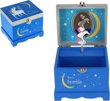 „Tato hrací šperkovnice bude ideálním místem pro uložení pokladů každé dívky. Šperkovnice je vyrobena ze dřeva, má krásnou modrou barvu a je zdobena hvězdami a motivem jednorožce, což z ní dělá ideální doplněk pro dětský pokoj. Pod krytem se zrcadlem je prostor pro pořádání suvenýrů nebo šperků. Také zde je bílo-růžový jednorožec, který se po natažení klíčku točí a hraje.