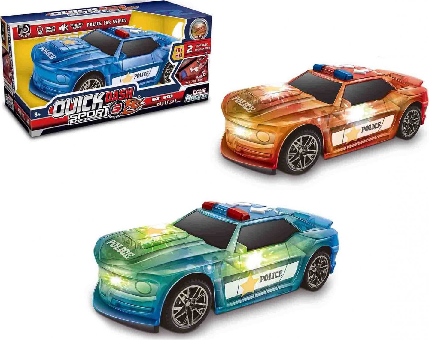 Auto policejní. Světelné a zvukové efekty tlačítky na střeše auta. 3xAA baterie součástí. Přepínač zvuku na spodní straně auta. 2 varianty – červená, modrá.