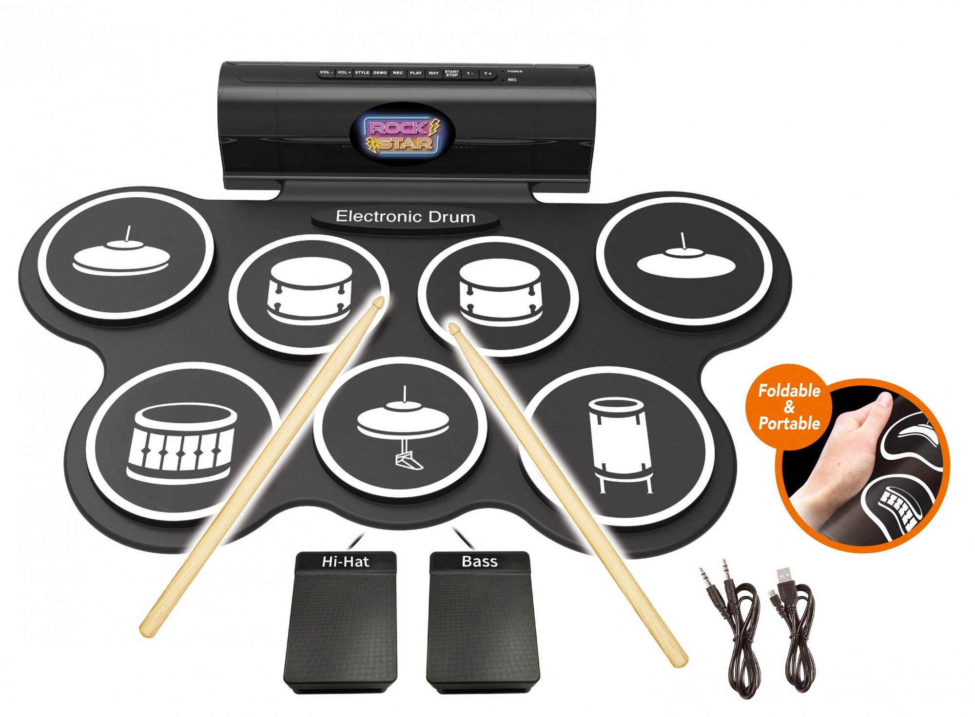 Elektronická bicí souprava s 2 pedály. Rozměry 44x32x6 cm. Světelné a zvukové efekty. 3xAA baterie součástí. Obsahuje 7 elektronických bubnů, 2 chodidlové pedály (hit-hat, bass), 2 dřevěné paličky, kabel na připojení mobilu/mp3 přehrávače, USB kabel, návod. Funkce – 7 realistických zvuků bubnů (pop, rock, latin, electro, percussion), 12 demo skladeb (funk, latin, dance, samba, cha-cha, swing hi-hat, upbeat rock, heavy rock), 9 rytmů, nahrávání (až 1000 úderů) a přehrávání, nastavení tempa a hlasitosti, konektor na připojení mobilu/mp3 přehrávače.