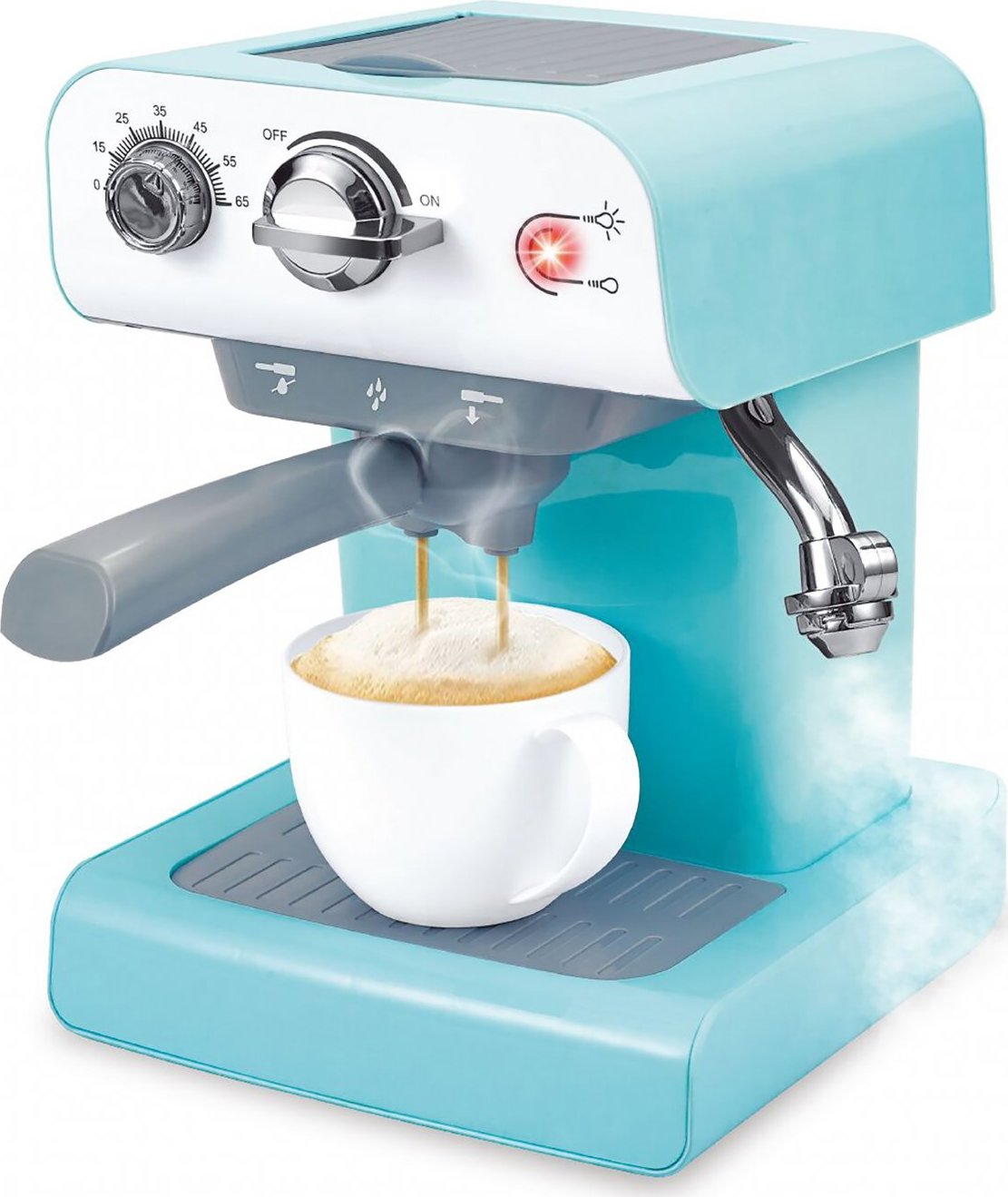 Kávovar pákový s efekty a párou. Rozměry 22x21x26.5cm. 3xAA baterie nejsou součástí. nádržka na vodu je na horní straně kávovaru. Když páka směřuje doprava, dá se odejmout nebo přidělat. Pro zafixování dejte páku směrem dopředu. Světelné a zvukové efekty. Když se kávovar zapne a rozsvítí se kontrolka, vychází z trysky pára.