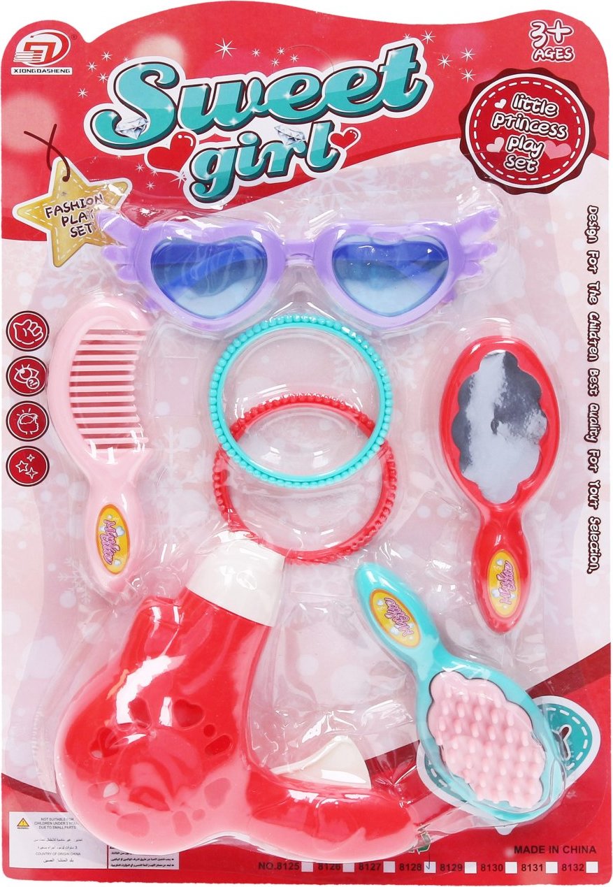 Kosmetický set. Součástí brýle, hřeben, kartáč, zrcátko, fén, 2 náramky.