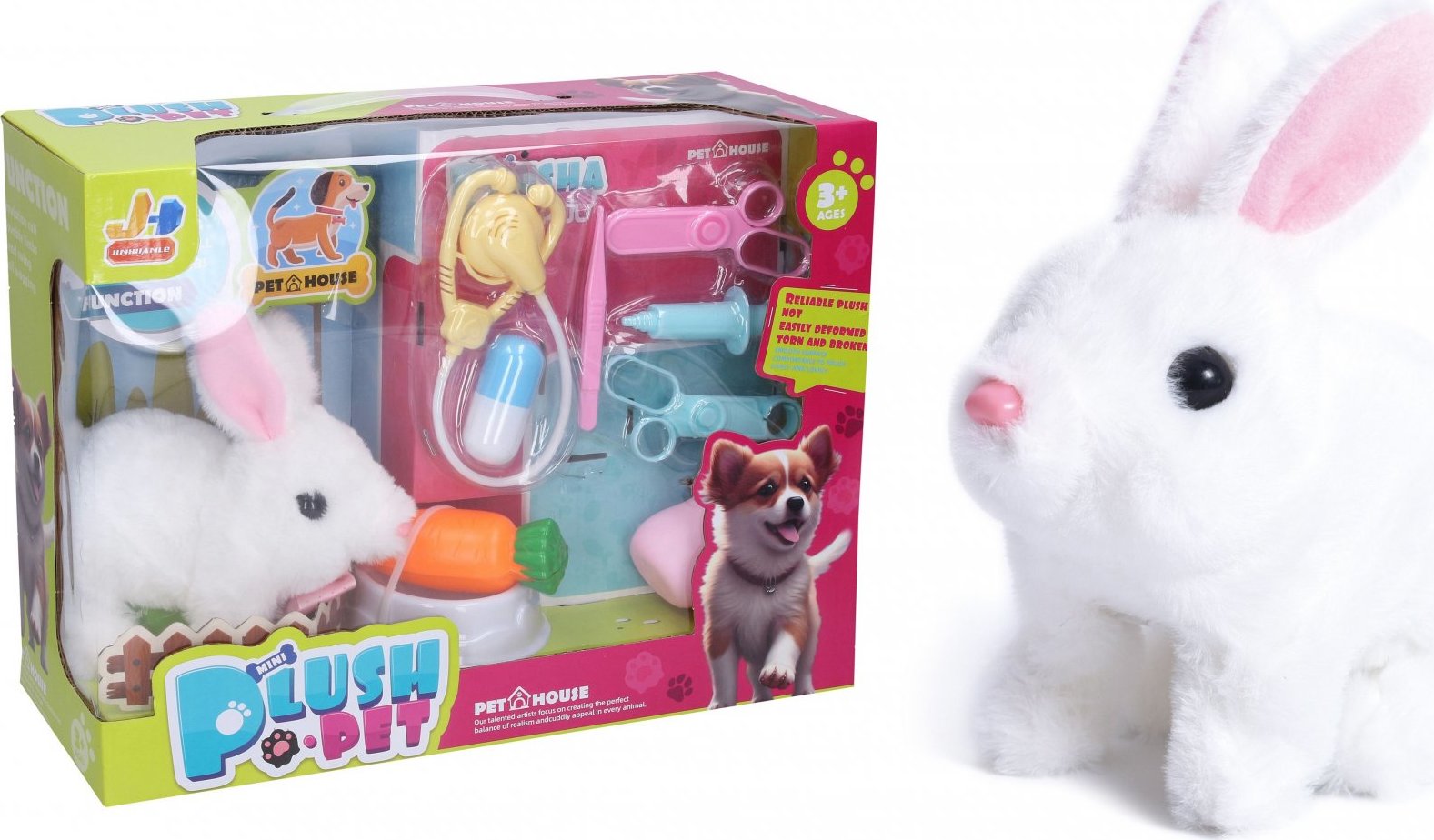 Králík chodící. Velikost 15 cm. Obsahuje: králíka, misku, mrkev, lahvičku, fonendoskop, injekci, nůžky, pinzetu. 2xAA baterie nejsou součástí. Králík hopká, vydává zvuk.