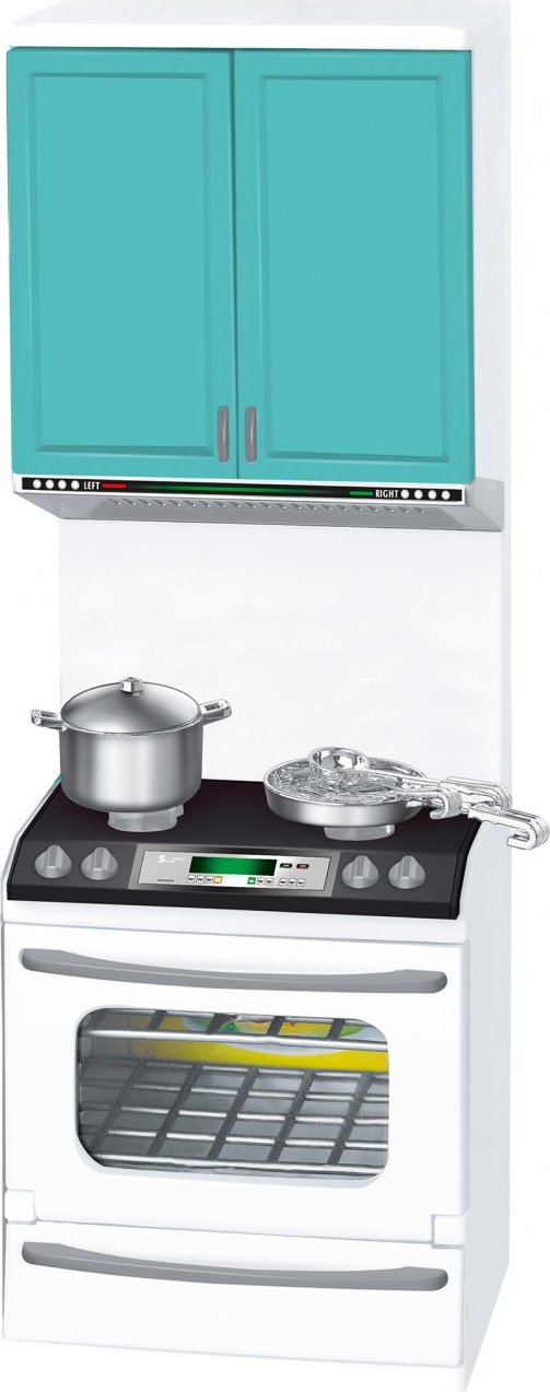 Kuchyňka. Rozměry 10x8x32 cm. Vařič a trouba vydává světelné a zvukové efekty. Efekty se zapínají spínačem na vařiči. 2xAAA baterie součástí.