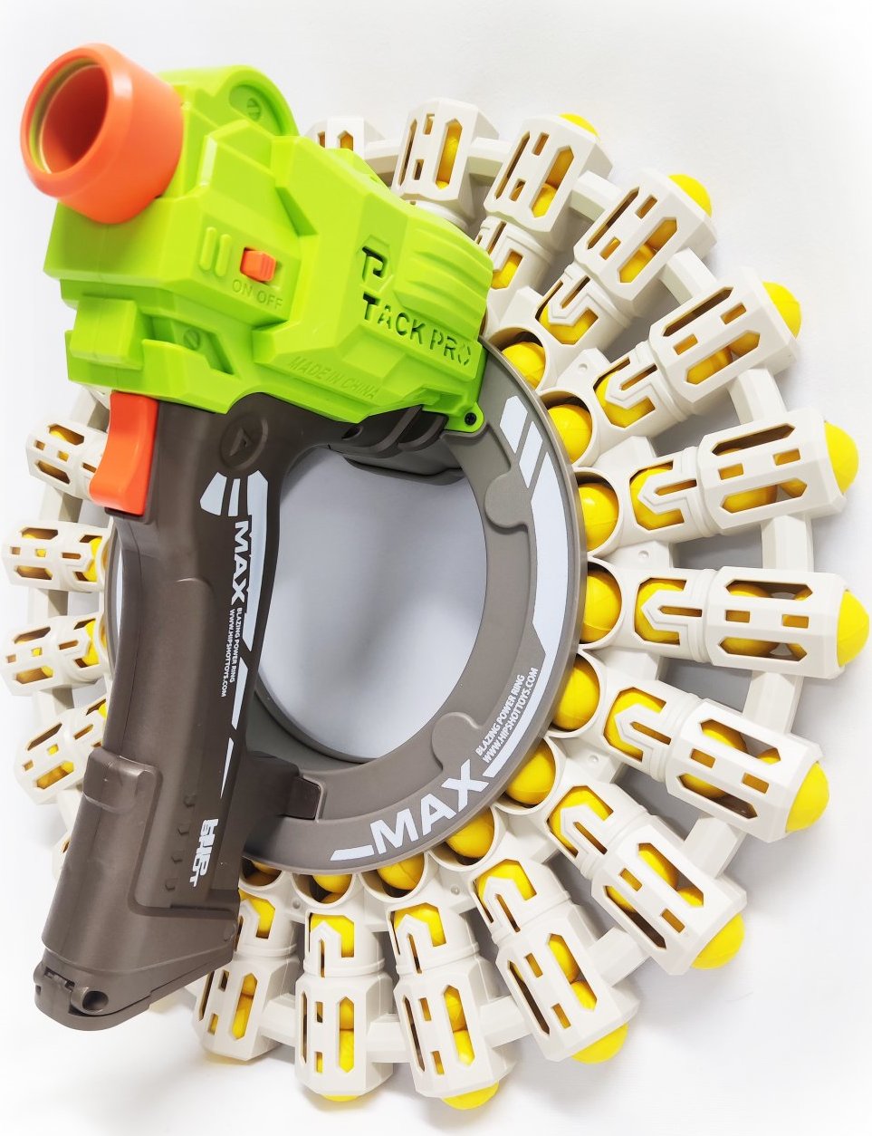 Pistole Spiral Enforcer s míčky. Rozměry 34,5×34,5×17,5 cm. Součástí 88 míčků, pytlík na míčky. 6xAA baterie nejsou součástí. Dostřel až 24 m. náhradní míčky W049343.