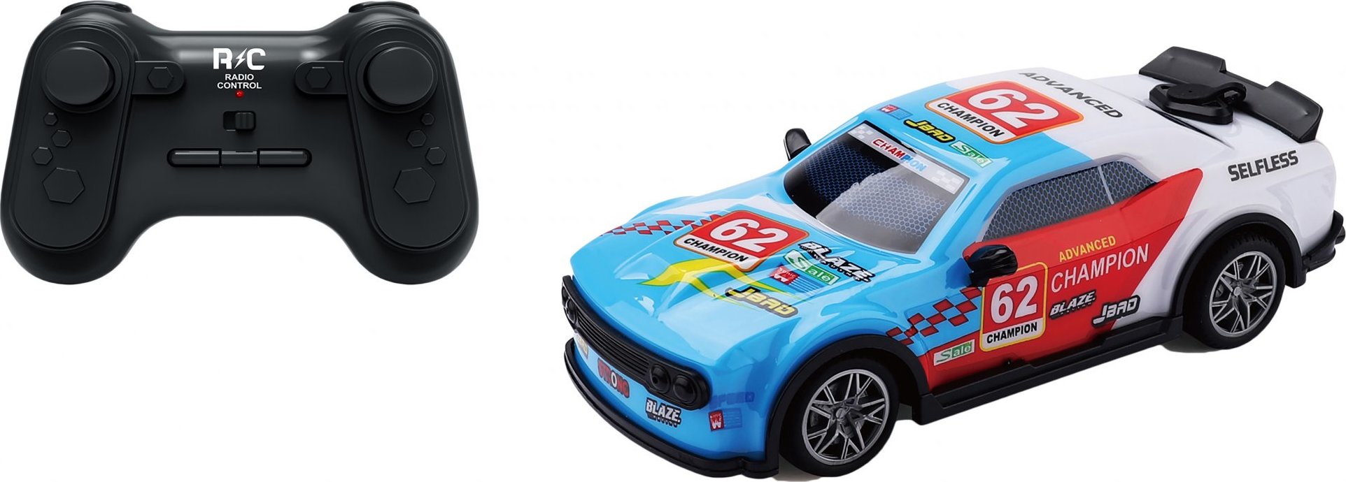 Auto 62 Champion svítící dýmící RC na dálkové ovládání. Rozměry 19x8x6 cm. Frekvence 2.4GHz. Světelné efekty povrchu auta. Dýmící efekty. Bateriový pack 3.7V 500mAh do auta součástí, 2xAA do ovladače nejsou součástí. USB kabel součástí. Přepínač ON/OFF na spodní straně obalu. Ovladač – přepínač ON/OFF, tlačítko – dýmící efekty, tlačítko – zvukové efekty. Nádržka na vodu v zadní části auta před křídlem.