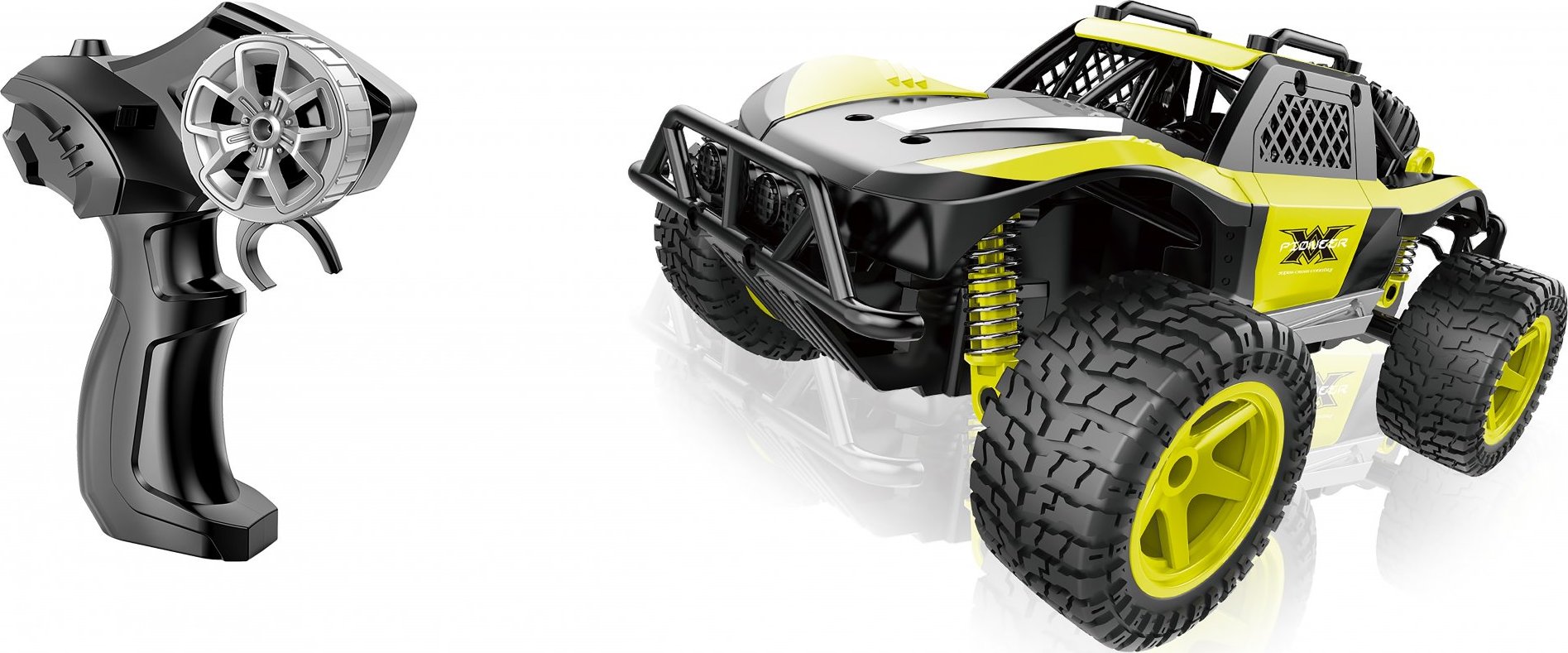 Bugina Pioneer RC na dálkové ovládání. Rozměry 24x16x11 cm. Frekvence 2.4GHz. Pistolový ovladač. Rychlost 20 km/h. Bateriový pack 3.7V Li-ion 500mAh do buginy součástí, 2xAA do ovladače nejsou součástí. Přepínač ON/OFF na spodní straně buginy a na ovladači.