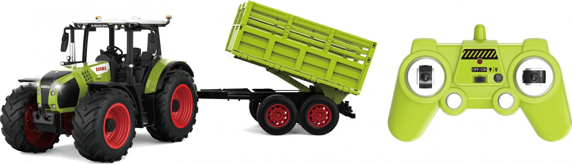 Claas Traktor s vlečkou RC na dálkové ovládání. Rozměry 43,6×11,4×19 cm. Frekvence 2.4GHz. Světelné efekty. Bateriový pack 3.6V 300mAh do traktoru součástí, 2xAA do ovladače nejsou součástí. USB kabel součástí. Přepínač ON/OFF na spodní straně traktoru a na ovladači. Tlačítko pro světelné efekty na ovladači. Sklopná a rozložitelná vlečka. Sklápění vlečky otočným mechanismem v zadní části traktoru. Obrázky s funkcemi na zadní a spodní straně obalu.