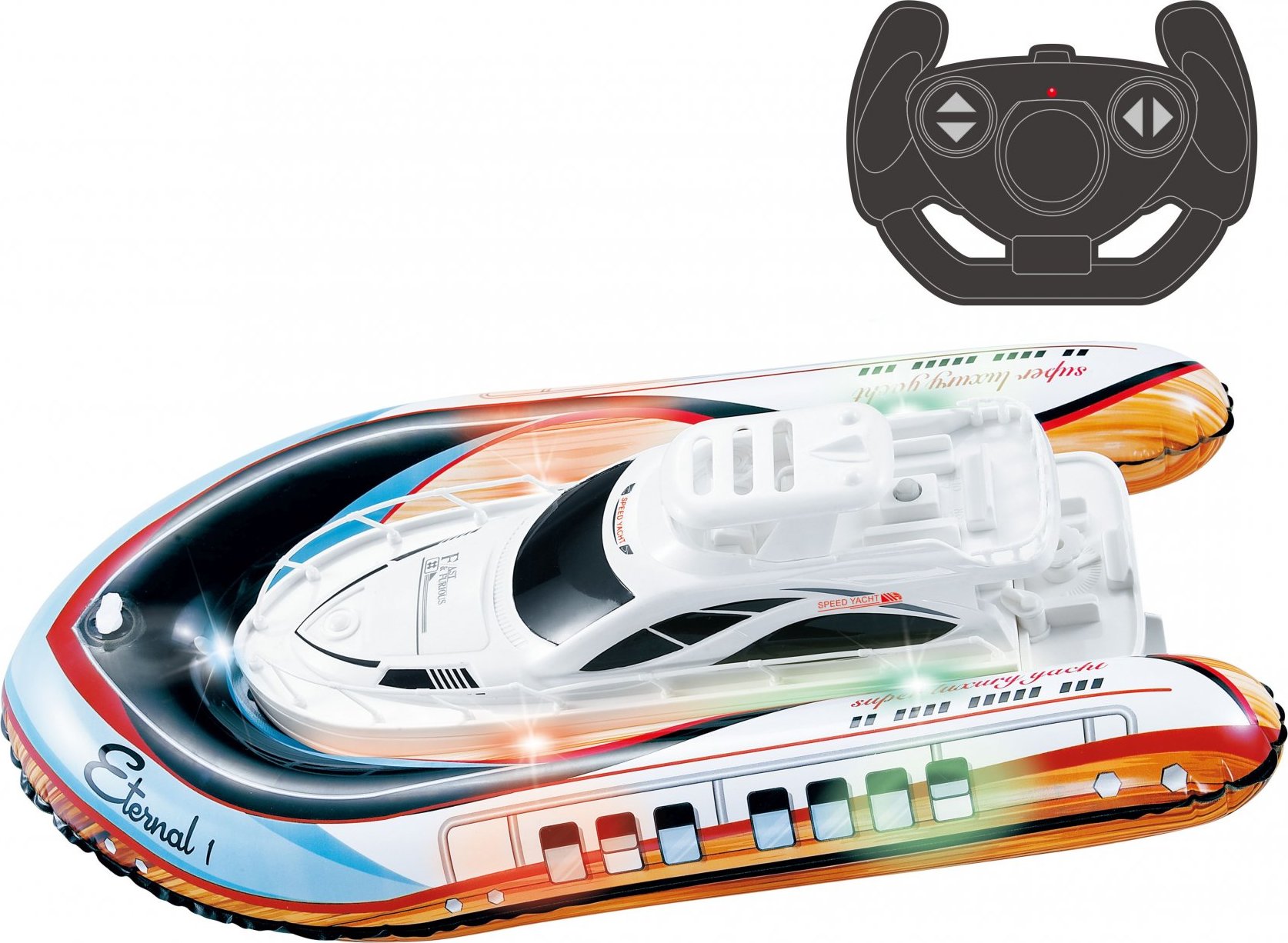 Loď jachta nafukovací RC na dálkové ovládání. Rozměry 37x20x6 cm. Frekvence 2.4GHz. Světelné efekty. 4xAA baterie do lodi, 2xAA do ovladače nejsou součástí. Tlačítko ON/OFF na lodi, přepínač ON/OFF na ovladači. Pumpa součástí.