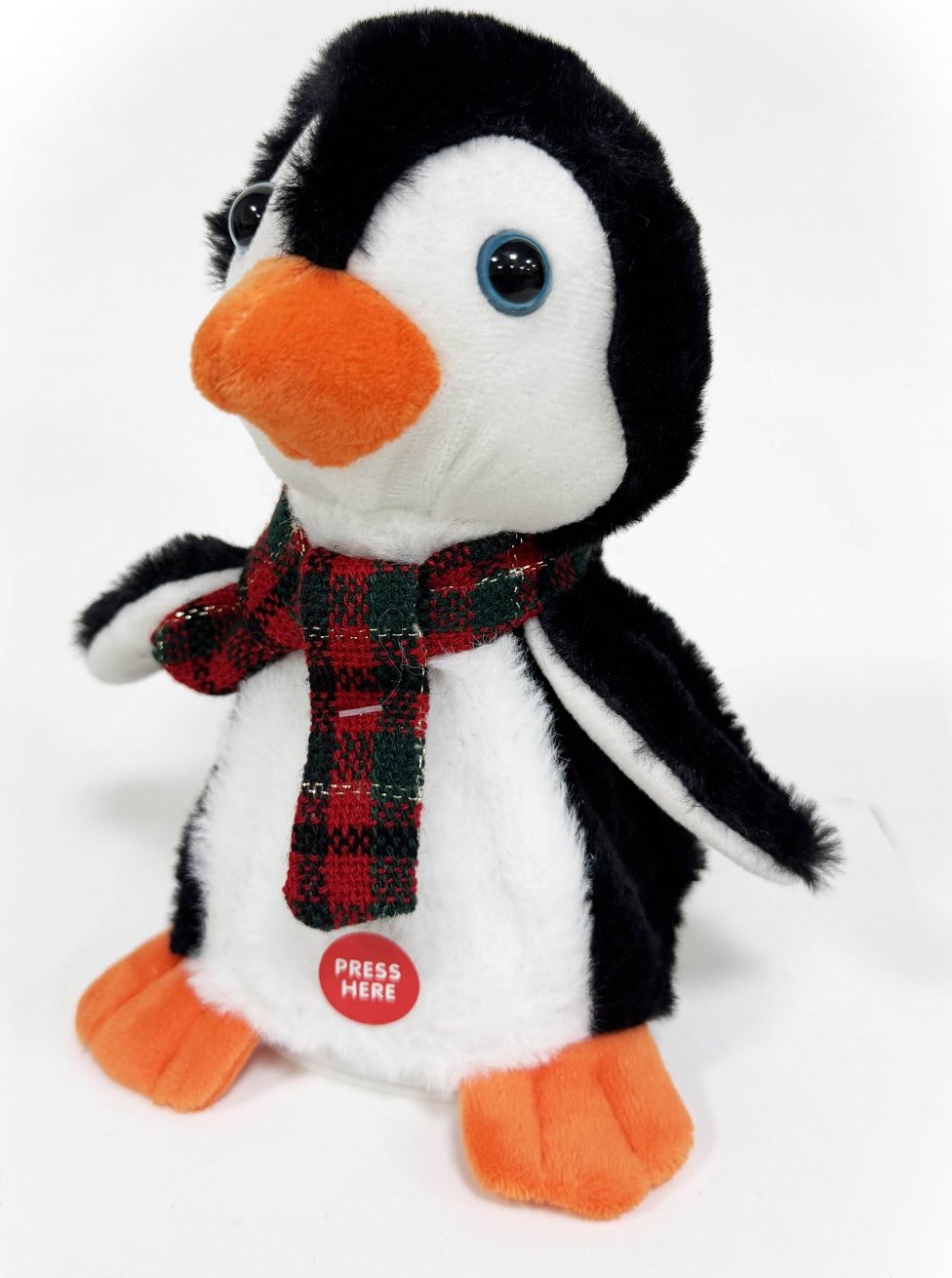 Tučňák opakuje co říkáš. Zvukové efekty, opakuje, tančí a zpívá. Rozměry 13x11x19 cm. Tlačítko na bříšku. 3xAAA baterie, součástí balení. Přepínač, OFF/TRY ME/PLAY.