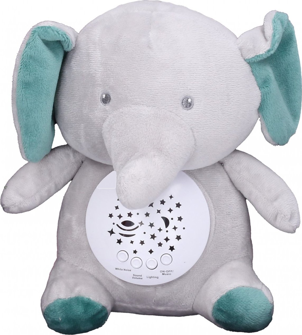 Usínací slon plyšový. Rozměry 26x12x25 cm. Funkce světla – 7 barev, mohou se automaticky měnit. 10 melodií, 4 bílý šum. Možnost nastavení hlasitosti. Automatické vypnutí po 30 minutách. 3xAAA baterie, nejsou součástí.