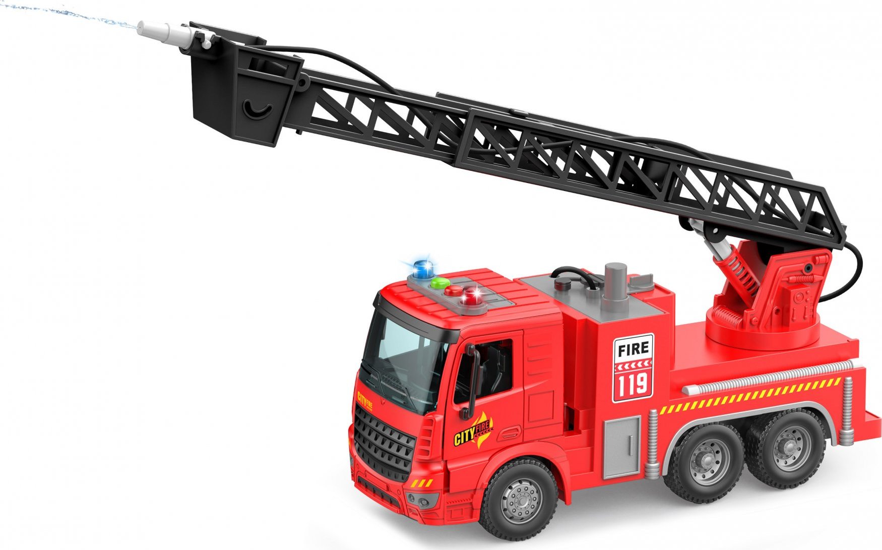 Auto hasičské stříkající s efekty. Velikost 30 cm. Na setrvačník. Vydává světelné a zvukové efekty, aktivace tlačítky na kabině. 3xAG13 baterie do střechy kabiny součástí. Nádržka na vodu se nachází uvnitř cisterny, zajištená zátkou na střeše. Stříkání tlačítkem na nádržce.