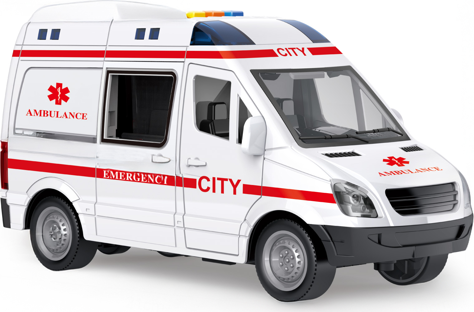 Auto sanitka s efekty. Rozměry 21x10x11 cm. Na setrvačník. Otevírací přední a zadní (posuvné) dveře. Světelné a zvukové efekty tlačítky na střeše. 3xAG13 baterie do střechy součástí.