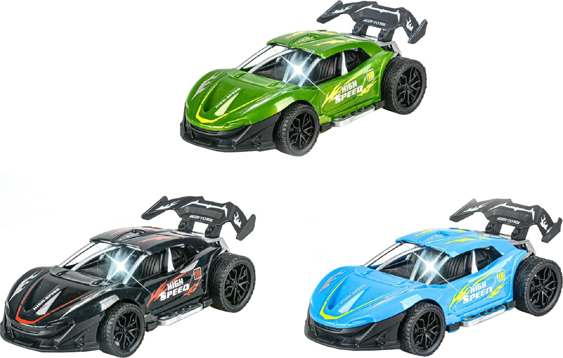 Auto závodní s efekty. Rozměry 16x8x5 cm. Na setrvačník. Světelné a zvukové efekty tlačítkem v kabině. 3xAG13 baterie součástí, nelze měnit. 3 varianty – zelená, černá, modrá.