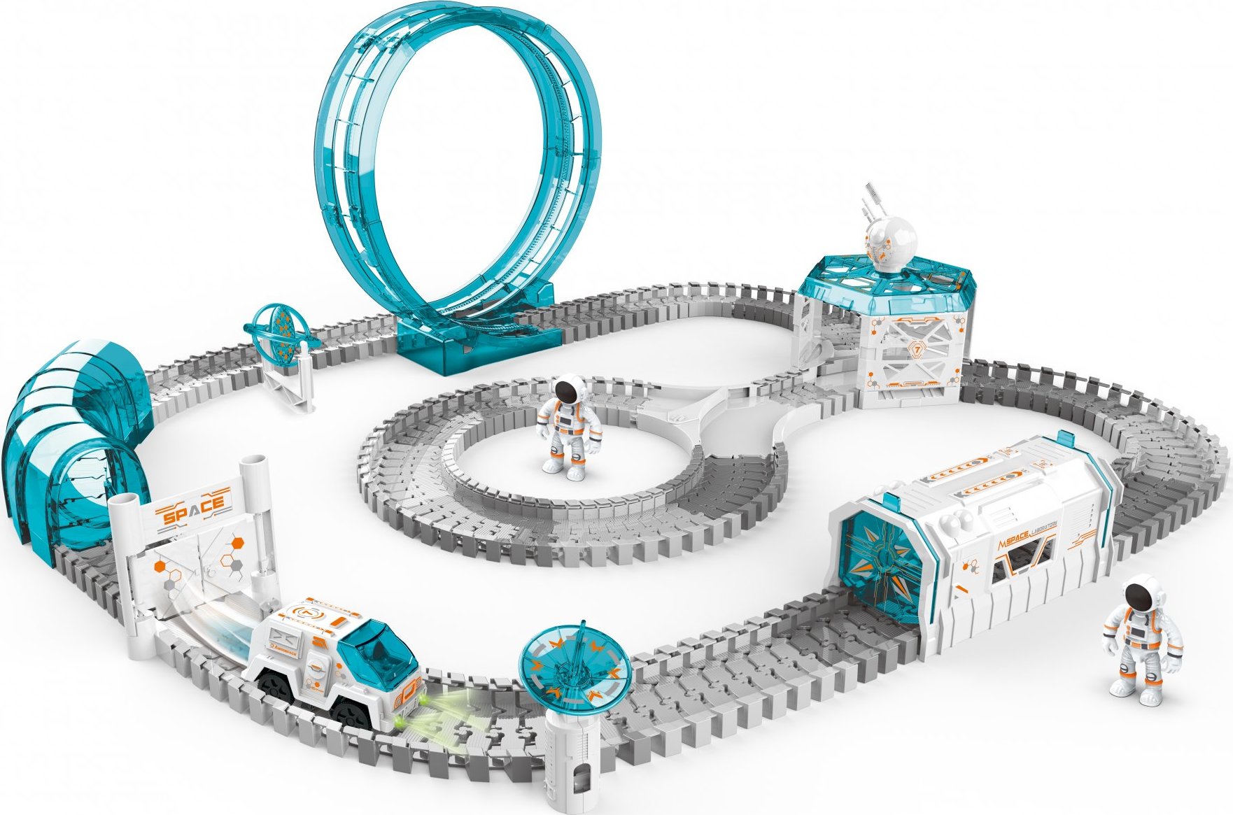 Kosmická dráha velká. Rozměry 85x75x32 cm. Součástí auto, kosmonaut, funkční projektor. Světelné efekty. 2xAAA baterie do auta nejsou součástí, 3xAG13 do projektoru součástí. Přepínač ON/OFF na spodní straně auta a na projektoru. Obrázkový návod na sestavení na obalu. Dráhu lze sestavit do různých tvarů dle obrázků na obalu.