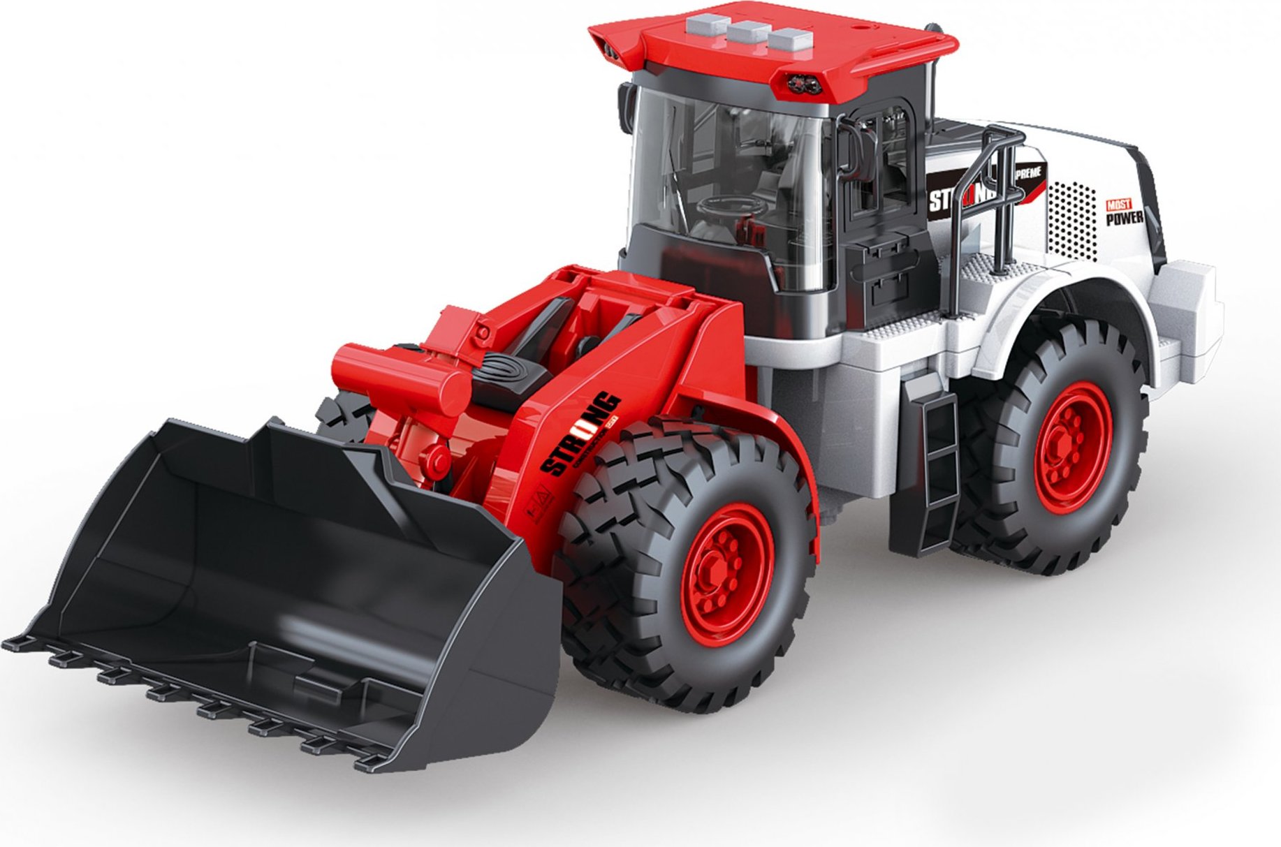 Nakladač s efekty na setrvačník. Velikost 30 cm. Vydává světelné a zvukové efekty. Aktivace tlačítky na střeše. Zvuky couvání, troubení, startování motoru, pohyby nakladače. 3xAG13 baterie, součástí balení.