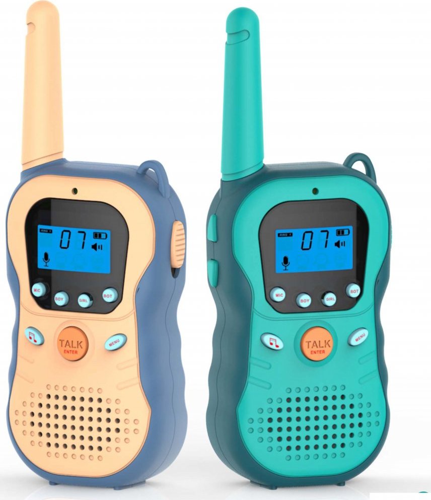 Vysílačky dětské. Rozměry 6×2,8×16 cm. Dosah až 3 km. Rádiové vlny. 4 druhy (normální, mužský, ženský, robotí). 8xAAA baterie (4xAAA do každé vysílačky) nejsou součástí. Přepínač ON/OFF na pravé straně vysílačky. Oranžové tlačítko – pro mluvení. Tlačítka ovládání hlasitosti (nahoru a dolů v menu) na levé straně vysílačky. Návod součástí.